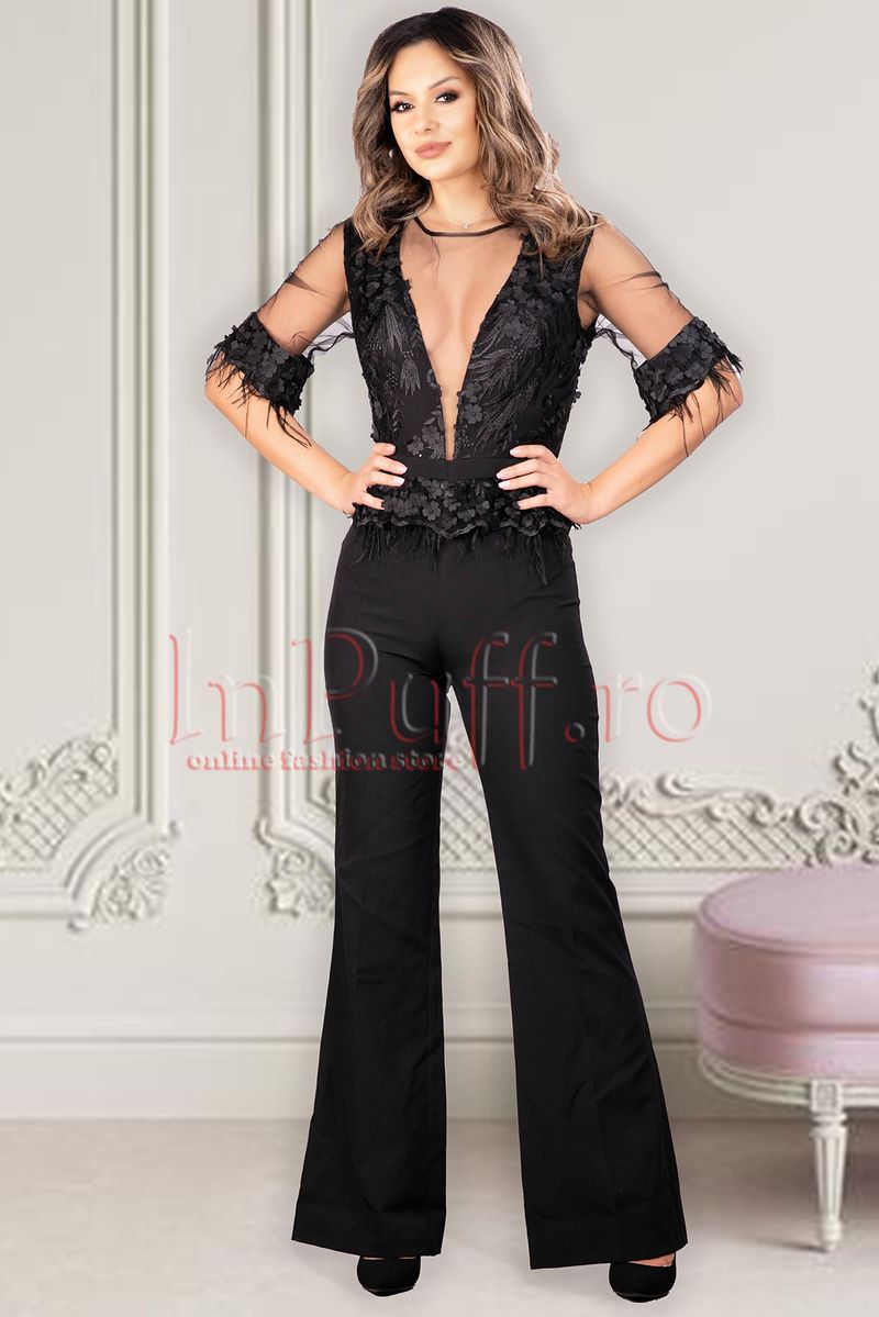 Iti doresti o salopeta indrazneata, senzuala, care sa atraga toate privirile si pentru care sa primesti complimente? Atunci ti se va potrivi perfect Salopeta eleganta dama MBG neagra din bistrech cu decolteu adanc in V accesorizata cu pene.