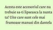 Orice rochie de mireasa se potriveste de minune cu o pereche de manusi din dantela. Sunt fine si dau un plus de eleganta tinutei tale, mai ales daca iti pun mainile in evidenta exact asa cum trebuie.