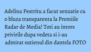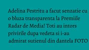 Tinuta vedetei a constat in doua obiecte vestimentare, o fusta neagra, dreapta si stramta, cu o palma peste genunchi, si o camasa alba, transparenta, fabuloasa, care lasa sa i se vada sutienul, gen bustiera, din dantela! Un plus si pentru funda cu paiete aplicata, ce a dat o nota glamour outfit-ului ales pentru petrecere! (declaratii uluitoare ale Adelinei Pestritu despre Madalin Ionescu)