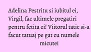 "Ai vazut ce are tatuat pe gat? Si-a scris Zenaida Maria. Mi-a luat-o inainte pentru ca eu nu ma pot tatua acum!", a mai spus Adelina Pestritu.