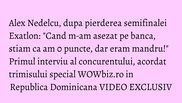 La scurt timp dupa ce a pierdut competitia pentru un loc in finala Exatlon, zambitor si chiar bucuros ca s-a incheiat o “aventura frumoasa”, Alex Nedelcu a oferit, un interviu in exclusivitate trimisului special WOWbiz.ro in Republica Dominicana.