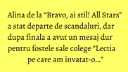 Alina a fost prima care a parasit finala “Bravo, ai stil! All Stars”, ea chiar marturisind ca a avut parte de ghinion in timpul numarului ei. “Inainte de toata sunt OM si da, emotiile m-au lasat fara glas. Ar fi trebuit la moment sa am mult fum, glob disco dar se pare ca am avut ghinion in ultimul moment”, a spus ea chiar la iesirea din platoul emisiunii.