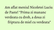 Si mai tarziu mananc o masa: drob cu verdeata. Atat! A doua zi, voi manca a doua masa: friptura de miel cu verdeata. Doua mese in doua zile si nu ma ingras si nici nu-mi va fi rau”, a declarat Nicoleta pentru WOWbiz.ro.