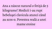 Ana Maria Nistor ne-a impartasit experienta primei ei nasteri, o nastere naturala a unei fetite frumoase de 5 kg. Nataliei i-a fost rupta clavicula la nastere pentru a putea fi scoasa mai usor, iar mama s-a ales cu ruptura de perineu si 17 copci. Prin ce alte greutati au trecut Ana si Natalia, cititi mai jos, intr-o poveste de viata suta la suta reala.