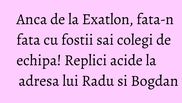 Anca s-a confruntat cu Radu si Bogdan, fostii sai colegi de la Exatlon. Razboinica si-a spus parerea in stilul caracteristic si a tinut sa lamureasca problemele din competitie.