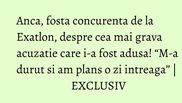 “Dintre acuzatiile aduse la Exatlon, cel mai tare m-a durut atunci cand am fost acuzata de scoaterea Andei din concurs. Am fost acuzata ca eu am accidentat-o si dupa tonul Faimosilor la vremea respectiva, mi s-a parut ca au crezut ca am accidentat-o in mod voit. Atunci chiar m-a durut si am plans ” , a spus Anca, despre cea mai grava acuzatie care i-a fost adusa la Exatlon.