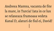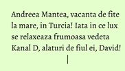 Dupa un sezon solicitant, Andreea Mantea a plecat in sfarsit in vacanta! Ea a ales sa se relaxeze in Turcia, intr-un resort fabulos din Belek. Si nu a plecat singura, ci alaturi de cea mai importanta persoana din viata ei, micutul David, fiul prezentatoarei Kanal D.