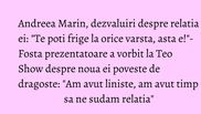 Andreea Marin, dezvaluiri despre relatia ei: "Te poti frige la orice varsta, asta e!"- Fosta prezentatoare a vorbit la Teo Show despre noua ei poveste de dragoste: "Am avut liniste, am avut timp sa ne sudam relatia"