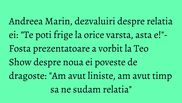 "Intotdeauna am vorbit deschis. Sunt deschisa in sensul asumarii, dar nu sunt deschisa de a da detalii din casa mea. Eu credeam ca e bine sa fii sincer, sa te bucuri de ceea ce ai, mult timp, multi ani. Asa credeam, dar lumea in care traim m-a invatat sa am rezerve. Am vrut sa crestem frumos, am avut sase luni de liniste, asta e bine. Am putut sa sudam relatia in perioada asta, doar noi doi", a spus Andreea Marin la Teo Show.