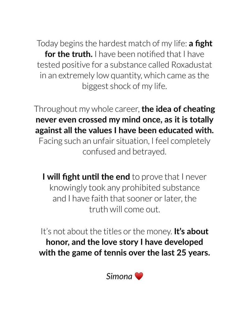 „Începe cel mai greu meci din viața mea: o luptă pentru adevăr! Am fost notificată că am fost testată pozitiv la o substanță numită Roxadustat, într-o cantitate extrem de mică. Este cel mai mare șoc din viața mea. În întreaga mea carieră, ideea de a trișa nu mi-a trecut niciodată prin minte, este complet împotriva principiilor și valorilor cu care am fost educată. În fața unei astfel de situații, mă simt confuză și trădată. Voi lupta până la final să demonstrez că nu am luat niciodată conștientă o substanță interzisă. Am încredere că, mai devreme sau mai târziu, adevărul va ieși la iveală. Nu este vorba despre titluri sau despre bani. E vorba despre onoare, despre dragostea pentru tenis pe care o am de 25 de ani” a scris Simona Halep, pe pagina ei de Facebook.
