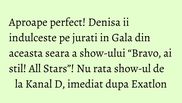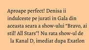 Momentul spectaculos pus in scena de concurenta il veti putea urmari in editia de astazi a Galei “Bravo, ai stil! All Stars”, difuzata imediata dupa “Exatlon”, la Kanal D!