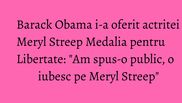 "Am spus-o public: O iubesc pe Meryl Streep. O iubesc. Sotul ei stie asta. Michelle stie si ea. Niciunul nu poate sa faca nimic", a declarat Barack Obama, glumet si zambitor, in timpul ceremoniei de la Casa Alba.