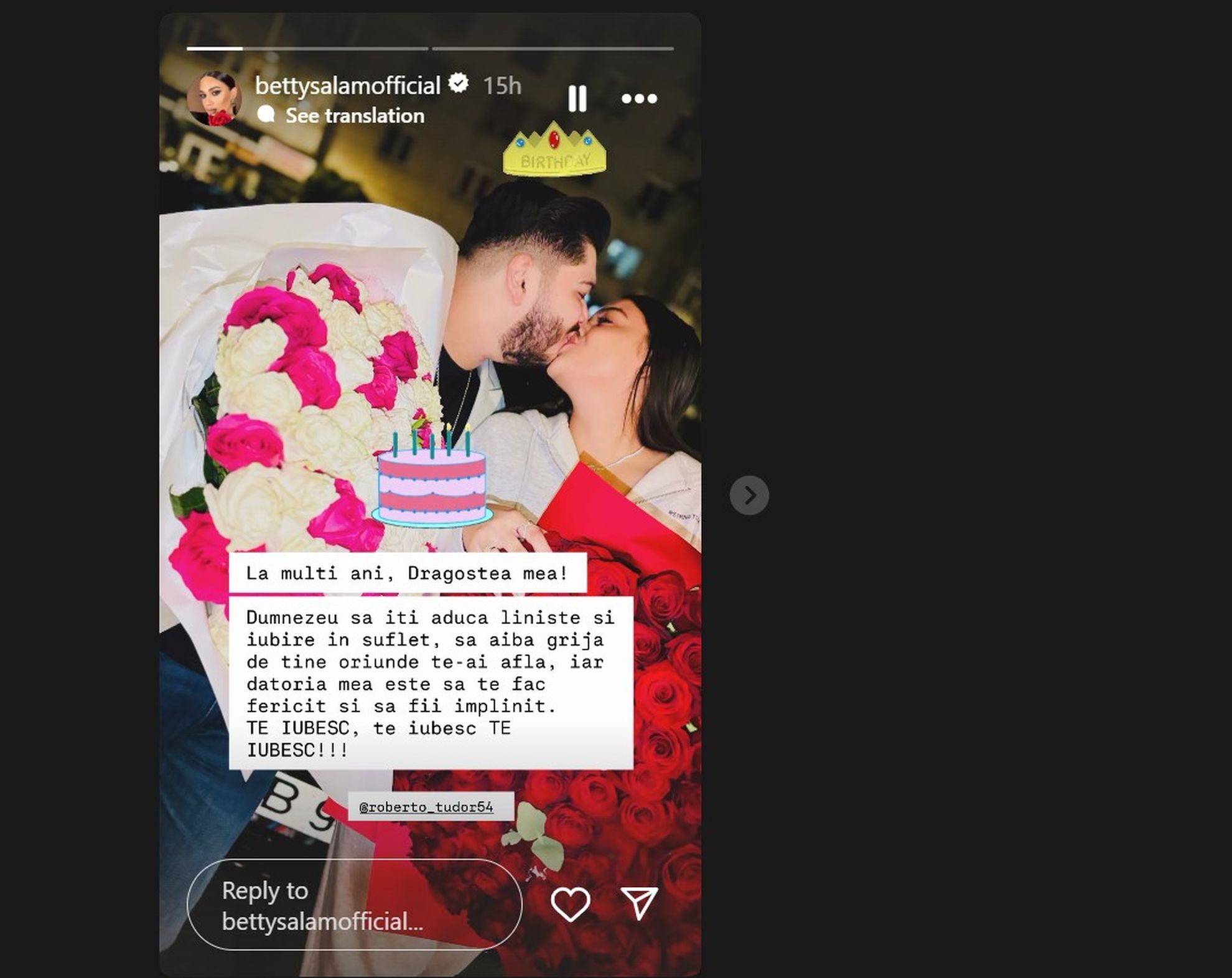 „La mulți ani, dragostea mea! Dumnezeu să îți aducă liniște și iubire în suflet, să aibă grijă de tine oriunde te-ai afla, iar datoria mea este să te fac fericit și să fii împlinit.