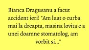 "Am facut un mic accident ieri. Ceva usor. Am luat o curba mai la dreapta, era o strada foarte stramta, era si o masina parcata acolo. Am zgariat un pic masina mea si un pic masina cealalta! A fost o zgarietura, se repara, tabla e tabla", a povestit Bianca Dragusanu astazi, in emisiunea ei de la Kanal D, scrie WOWbiz.ro.