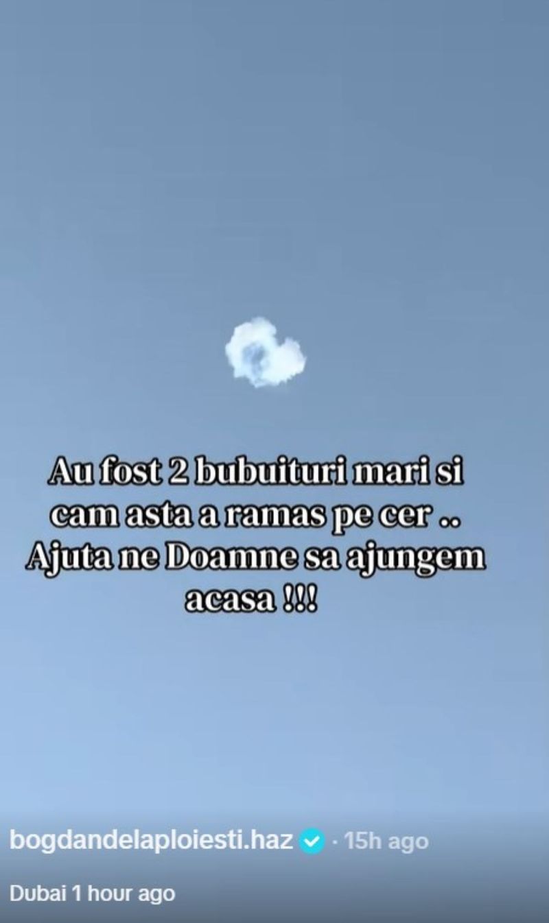 Imaginile publicate de Bogdan de la Ploiești au surprins urme de fum pe cer, iar mesajul său a generat rapid reacții din partea fanilor, care i-au transmis gânduri bune și i-au urat să revină în siguranță în România.„Au fost două bubuituri mari și cam asta a rămas pe cer. Ajută-ne, Doamne, să ajungem acasă”, a mai transmis Bogdan de la Ploiești.