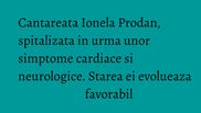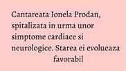 Cantareata de muzica populara Ionela Prodan a fost internata la Spitalul Universitar de Urgenta Elias in urma unor simptome cardiace si neurologice, iar starea ei evolueaza favorabil si urmeaza un tratament sub supraveghere.
