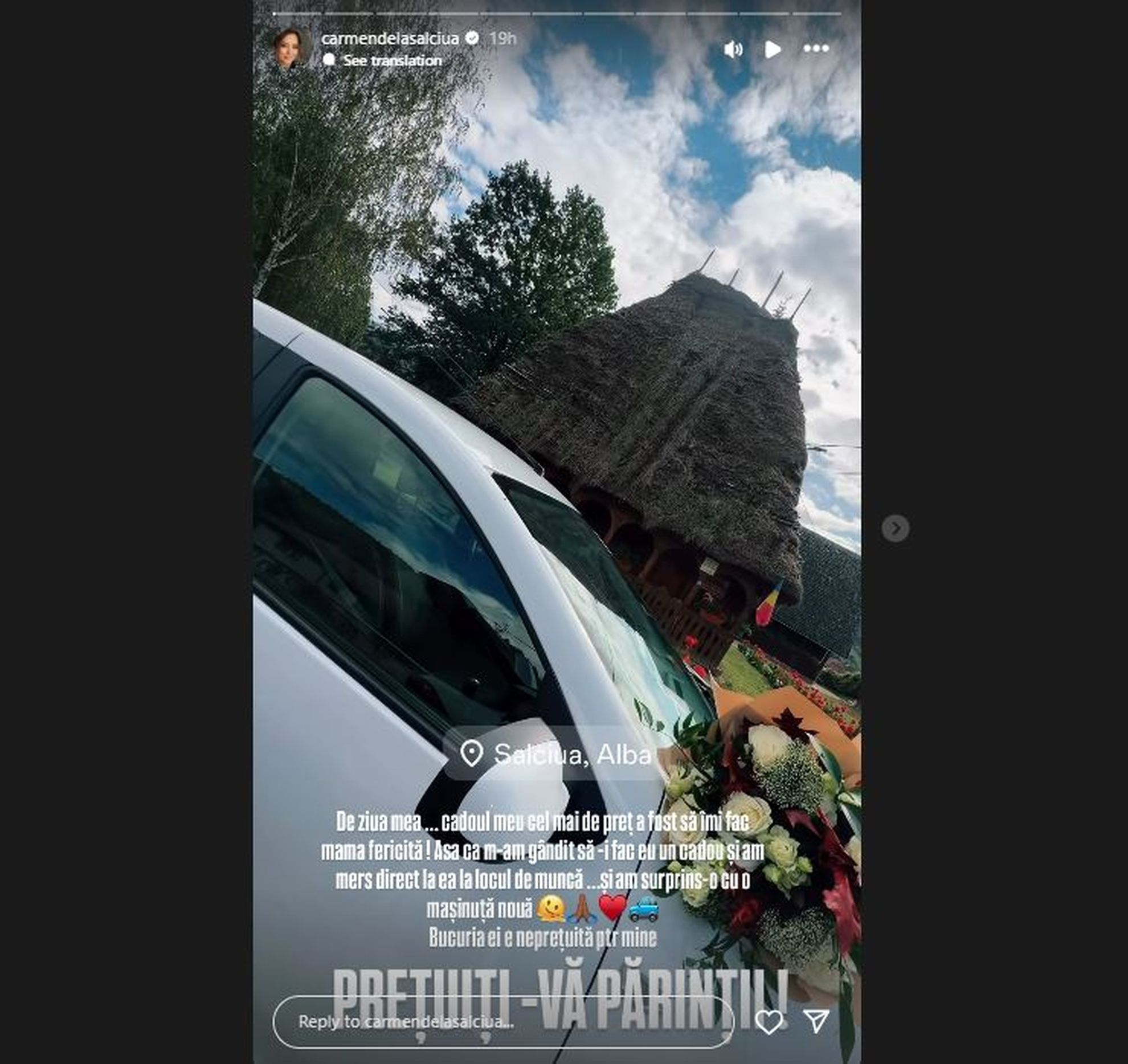 a văzut-o, fiind vizibil emoționată, chiar dacă se afla la locul de muncă în momentul în care fiica sa a surprins-o cu noua sa mașină."De ziua mea... cadoul meu cel mai de preț a fost să îmi fac mama fericită! Așa că m-am gândit să-i fac eu un cadou și am mers direct la ea la locul de muncă... și am surprins-o cu o mașinuță nouă! Bucuria ei e neprețuită pentru mine! Prețuiți-vă părinții!", a fost mesajul transmis de Carmen de la Sălciua, la filmulețul postat pe pagina sa de Instagram, la Story.