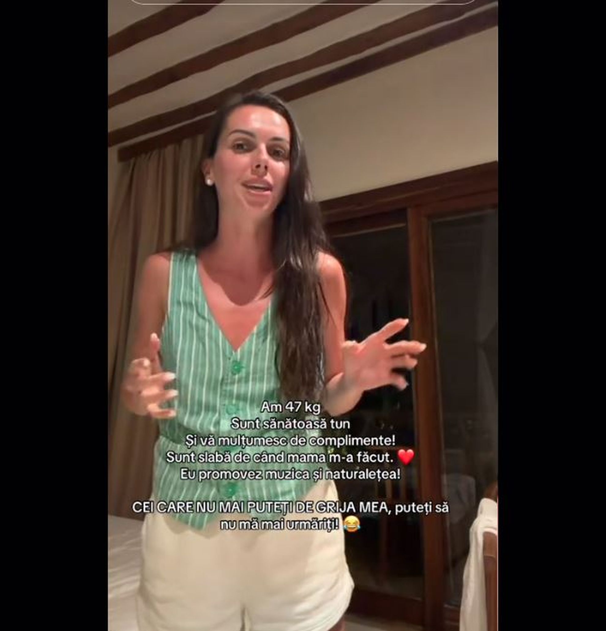 E foarte important, fetelor, să ne acceptăm așa cum suntem și să nu mai băgăm în seamă gura lumii sau comentariile astea negative pe care eu le-am citit acum în online, uitandu-mă la video-urile mele. Nu știu cum să vă zic, dar eu cred că mă credeți, adică chiar aș avea posibilitatea să-mi fac ceva, să-mi pun și sâni, să-mi pun și fund, dar pentru ce? Că meseria mea nu este de a provoca bărbații să mă urmărească. Eu nu vreau să mă urmăriți după cum arăt, vreau să-mi ascultați muzica și să fac oamenii fericiți.