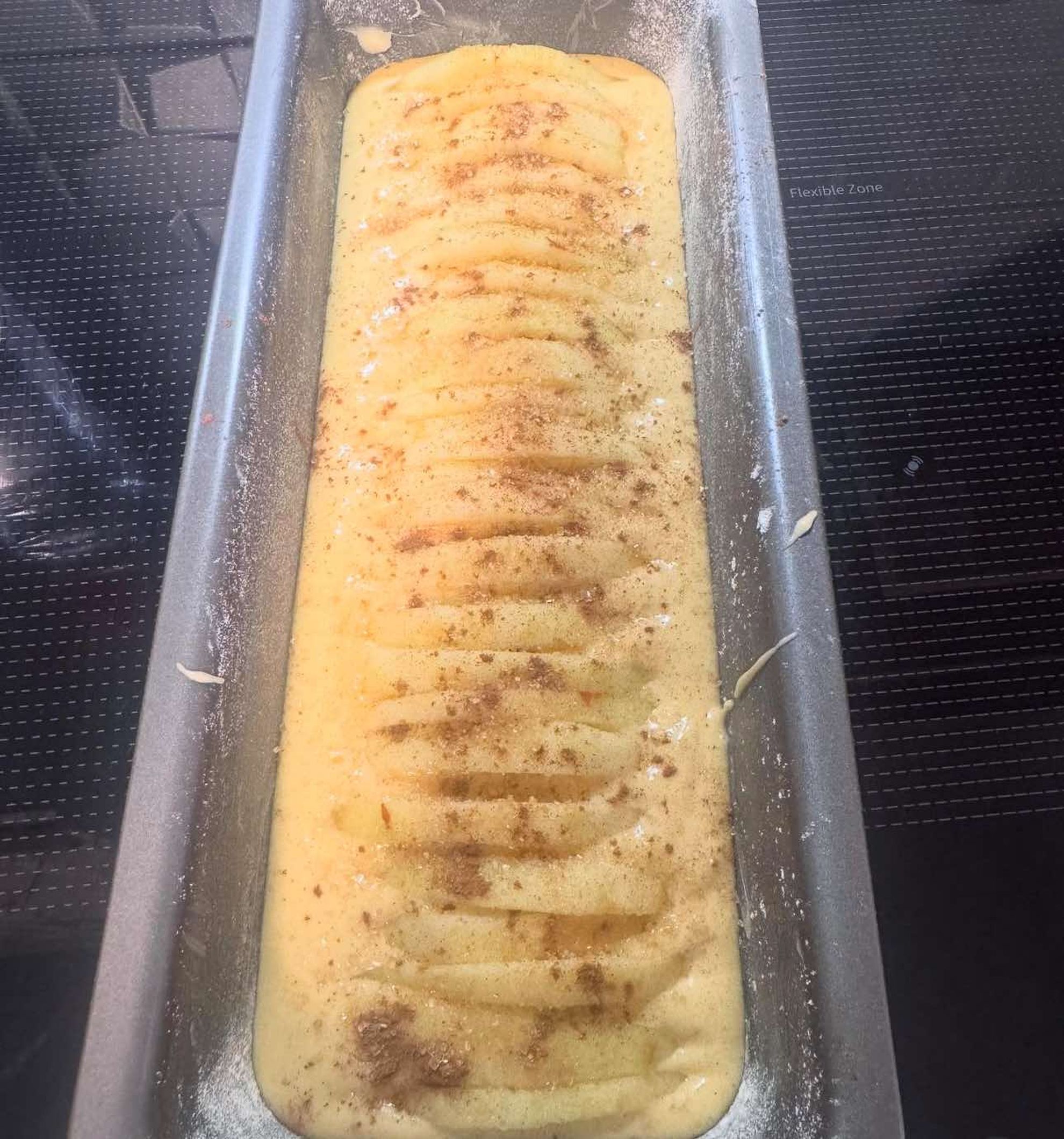 "Batem untul cu zahărul, ouăle, coaja rasă de lămâie, 1 vârf de sare. Incorporăm treptat ingredientele uscate, cu ajutorul unei spatule (făina amestecată cu praful de copt). Turnăm compoziția într-o formă de chec tapetată cu unt și făină. Așezăm feliile de măr, pudrăm deasupra cu scorțișoară și zahăr brun. Se dă la cuptor 40 min la 165-170 grade."