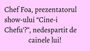 Filmarile pentru show-ul culinar “Cine-i Chefu’?” sunt in toi pe masura ce marea premiera a emisiunii de luni, 18 iunie, de la ora 17:00 se apropie cu pasi repezi. Chef Foa, gazda celui mai spectaculos si distractiv show culinar, "Cine-i Chefu'?", este una dintre cele mai bine pazite vedete din Romania. Indragitul prezentator este insotit peste tot de catelul sau, un ciobanesc belgian tervueren pe nume Putz, care nu il scapa din ochi.