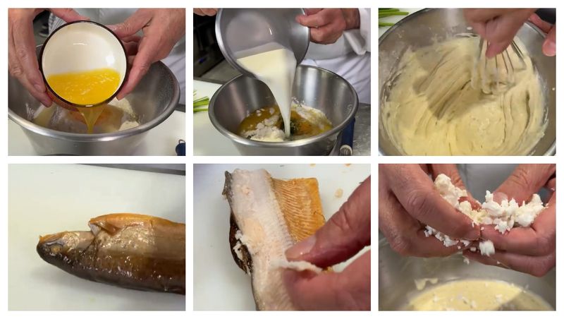 - "Amestecați* cu un tel toate ingredientele până când nu mai sunt cocoloașe, mai puțin brânza și peștele.