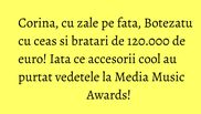 De multe ori, insa, accesoriile sunt cele care le fac aparitia cu adevarat unica. La Media Music Awards, spre exemplu, celebra gala de premii muzicale ce va fi organizata anul acesta la Sibiu pe 18 septembrie, artistii si invitatii speciali s-au intrecut pana acum in outfituri impresionante si accesorii exceptionale.