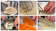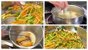 După ce totul este ales cu grijă, bucătarul pregătește aluatul pe care îl lasă la frigider timp de 30 de minute, feliază morcovii și ghimbirul, toate finuț, usturoiul mediu, ceapa verde cu pastele de fasole, crestează creveții în partea din interior, pune sare, coajă de lime și lasă 30 de minute la frigider să se îmbine în arome. Încinge o tigaie în care pune usturoiul și ghimbirul, apoi vine cu legumele, adaugă ulei de susan, iar în acest timp trece creveții prin aluat și îi lasă să se gătească uniform.