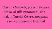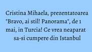 “Sunt fascinata de acest oras! Imi doresc sa merg in bazar, sa fac cateva cumparaturi. Deja mi-am pus in minte ce vreau sa-mi achizitionez: papucii aceia traditionali, cu ciucure. Probabil ma veti vedea incaltata cu ei la emisiunea "Bravo, ai stil! Panorama". Nefiind la prima mea vizita in Istanbul, imi doresc ca in aceste zile sa revin intr-o piata cu peste unde se poate manca dumnezeieste”, ne-a spus Cristina Mihaela, inainte de a pleca in vacanta.