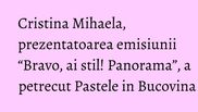 “Atmosfera de sarbatoare este minunata in Bucovina, oamenii te primesc cu caldura. M-a fascinat frumusetea oualor incondeiate si pictate de oamenii priceputi ai locului. In noaptea de Inviere am fost la manastirea Voronet si am luat lumina. Manastirile din aceasta regiune sunt de basm! A fost o calatorie superba!”, a povestit Cristina Mihaela.