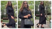 Pentru o zi la serviciu, prezentatoarea TV a optat pentru o rochie neagră cu buline albe, lungă, elegantă, cu detalii prețioase la gât și la mâneci, pe care a acesorizat-o cu o pereche de sandale negre și o geantă neagră.