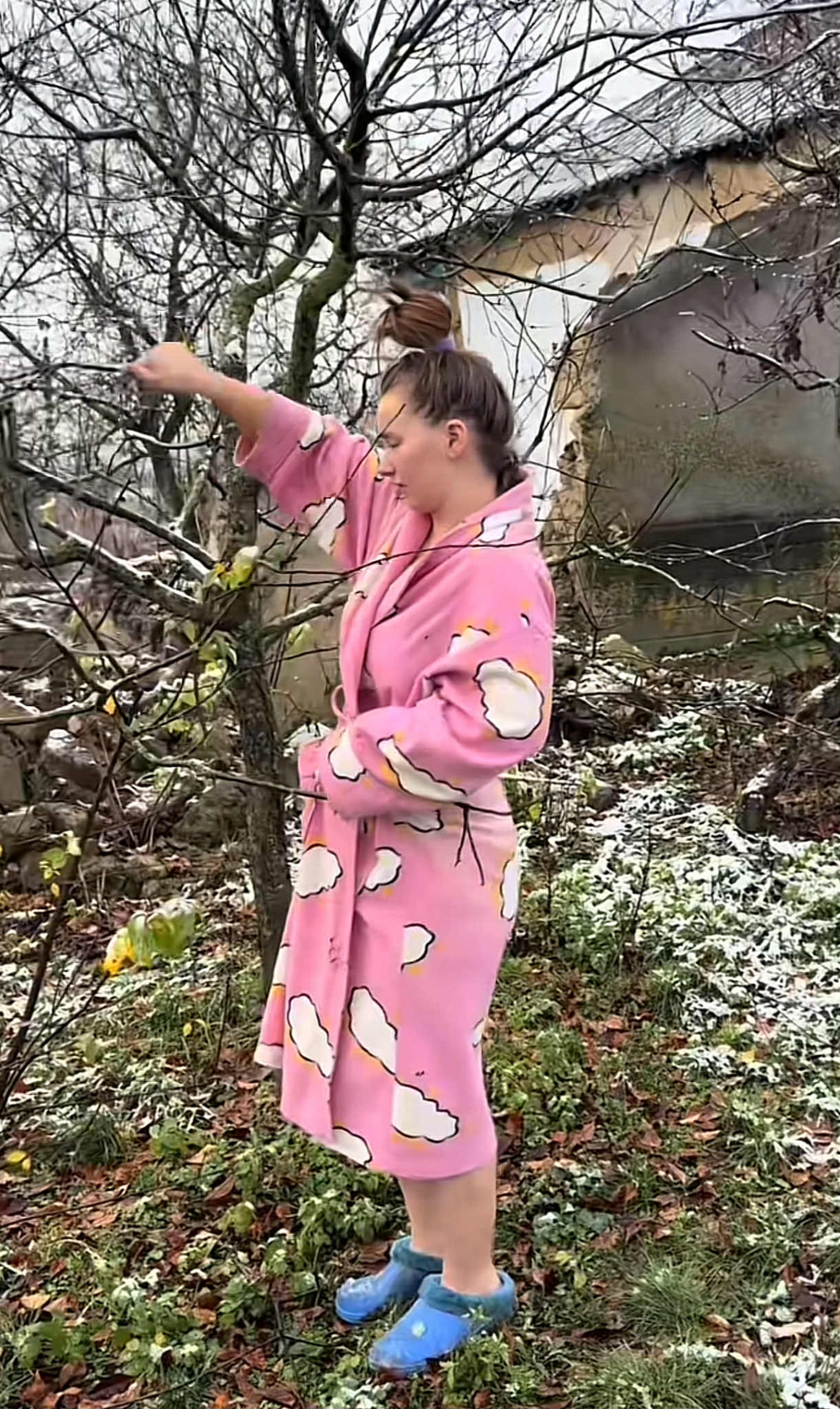 „c. Nu mă așteptam să văd zăpadă la mijlocul lui noiembrie. Faceți cunoștință cu fratele meu. Noi suntem patru surori și mai avem și un frate. Ne-am încălțat și am mers după lemne să facem focul în casă. Mi s-au terminat pachețelele de ceai, așa că mi-a venit o idee genială să facem ceaiul copilăriei din crenguțe de vișin. Am rupt niște crenguțe, iar eu cred că acest ceai este cel mai gustos și sănătos și l-aș pune și pe primul loc.