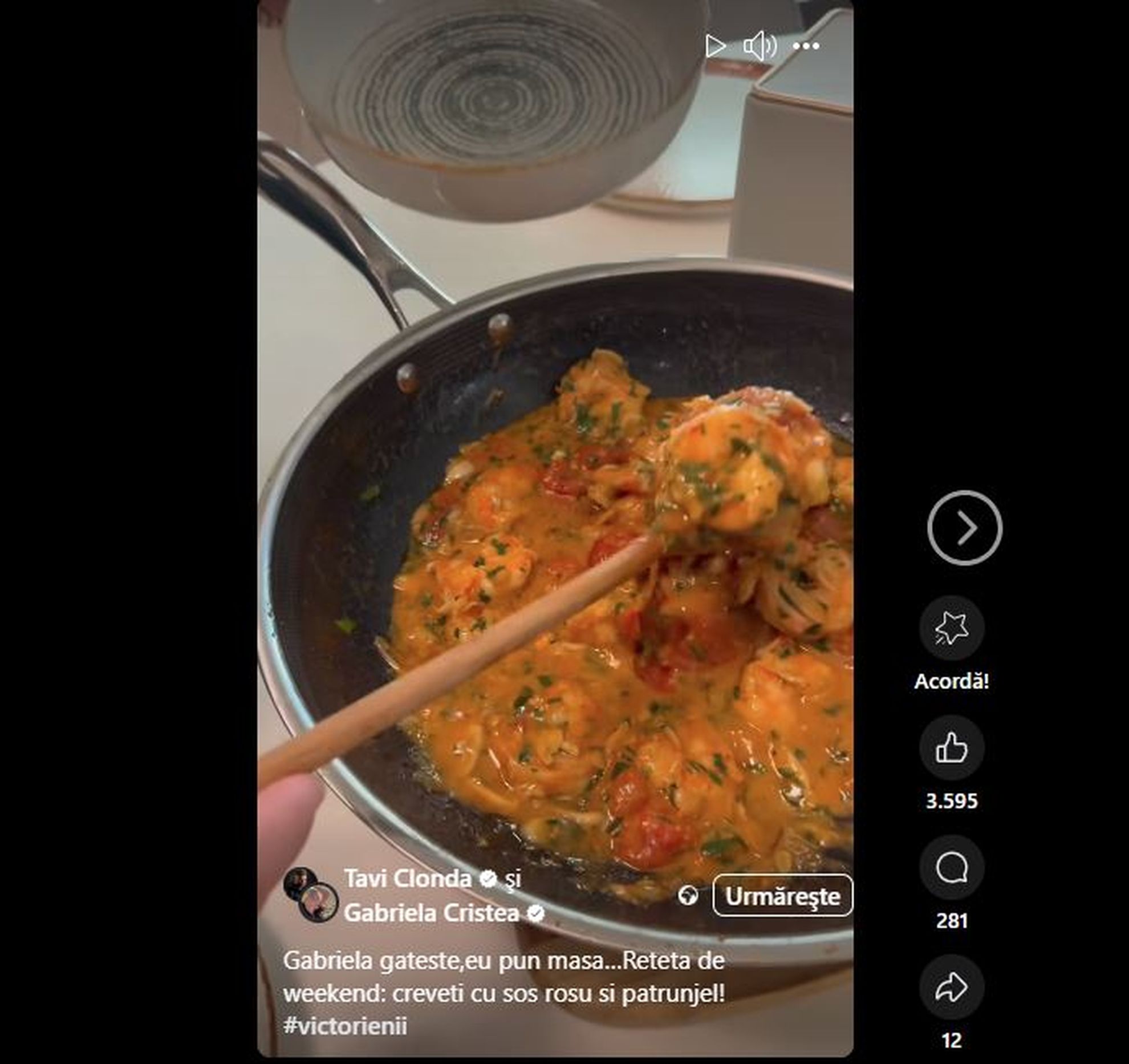 În cursul zilei de ieri, aceasta a postat un filmuleț pa pagina sa de Facebook, acolo unde se află alături de soțul său, Tavi Clonda și așezau masa. Astfel, Gabriela Cristea a pregătit o rețetă delicioasă de creveți cu sos roșu și pătrunjel, rețetă adorată de artist, dar și de fetițele lor, iar cum fosta prezentatoare TV a fost cea care a gătit, soțul său a fost cel care a ajutat-o să pună masa.