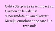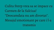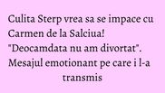 "Saptamana trecuta m-a oprit un preot de la noi din sat: <Culita, vezi ca te-ai bagat intr-o mare prapastie!>. Deocamdata nu am divortat. A ramas ca prin septembrie sa mergem. Trebuia sa mergem in 7 august sa semnam inca o data, noi suntem plecati atunci si am zis sa mergem in septembrie. Poate ca e si un semn. O sa fie, probabil o sa fie, nu stiu (n.r.- divortul). Cred ca ea (n.r.- isi doreste divortul). Eu sunt omul care iti spun o data, zici ca nu, eu nu te mai rog a doua oara. Un mesaj pentru ea: mi-e dor de tine, atat!", a spus Culita Sterp.