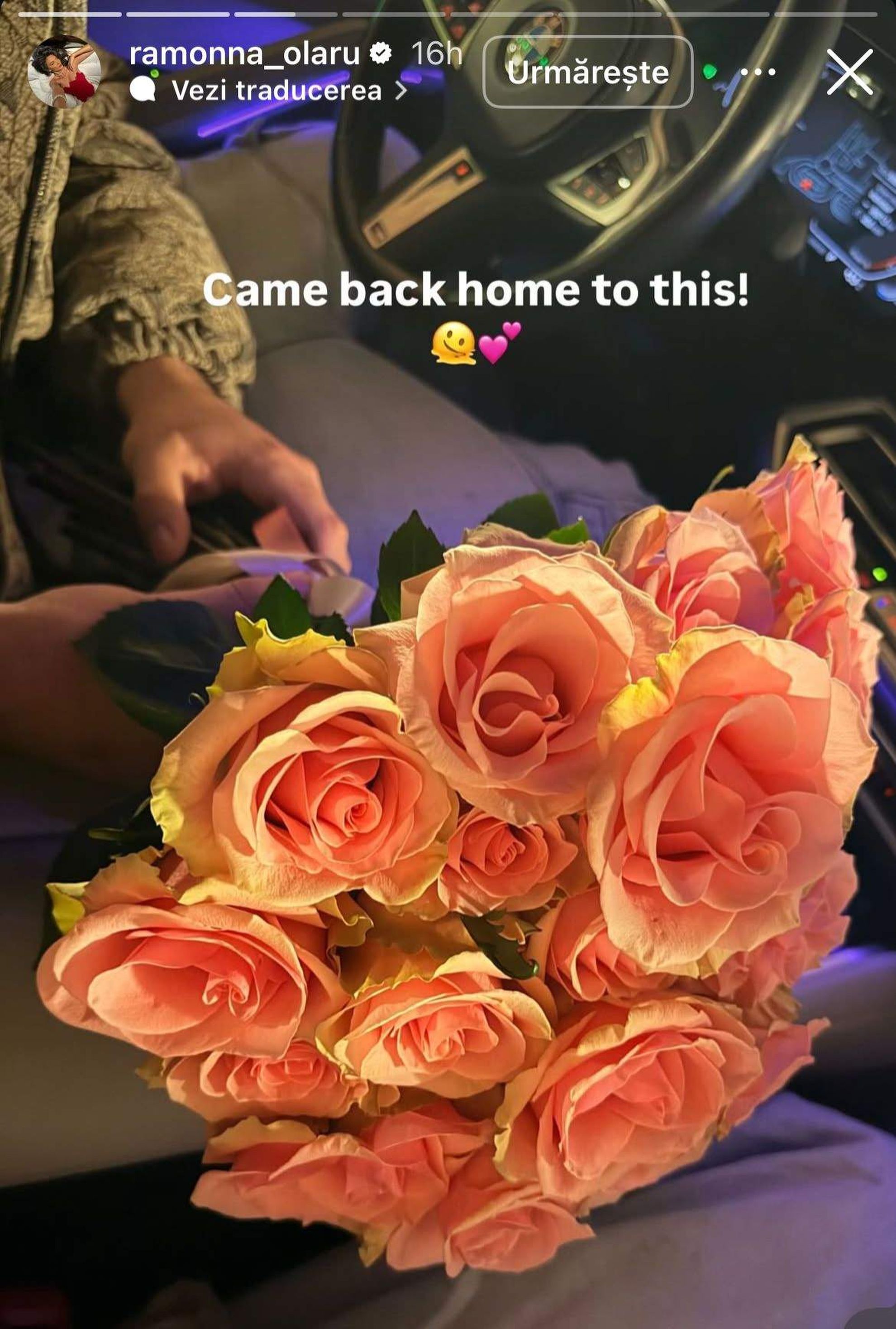 Ramona Olaru iubește din nou, asta după ce chiar și ea credea că are ghinion în dragoste. Lucrurile s-au schimbat în bine, iar vedeta TV se pare că este din ce în ce mai îndrăgostită, deoarece nu lipsesc mici semne de lângă bărbatul care o face fericită. De curând, Ramona a postat o fotografie din mașină, afișându-se cu un buchet de trandafiri și cu mențiunea că așa a fost așteptată când s-a întors acasă: „Am venit acasă la asta!”. Vedeta nu a întârziat să publice imaginea pe Instagram, acolo unde a postat și altele zilele trecute.