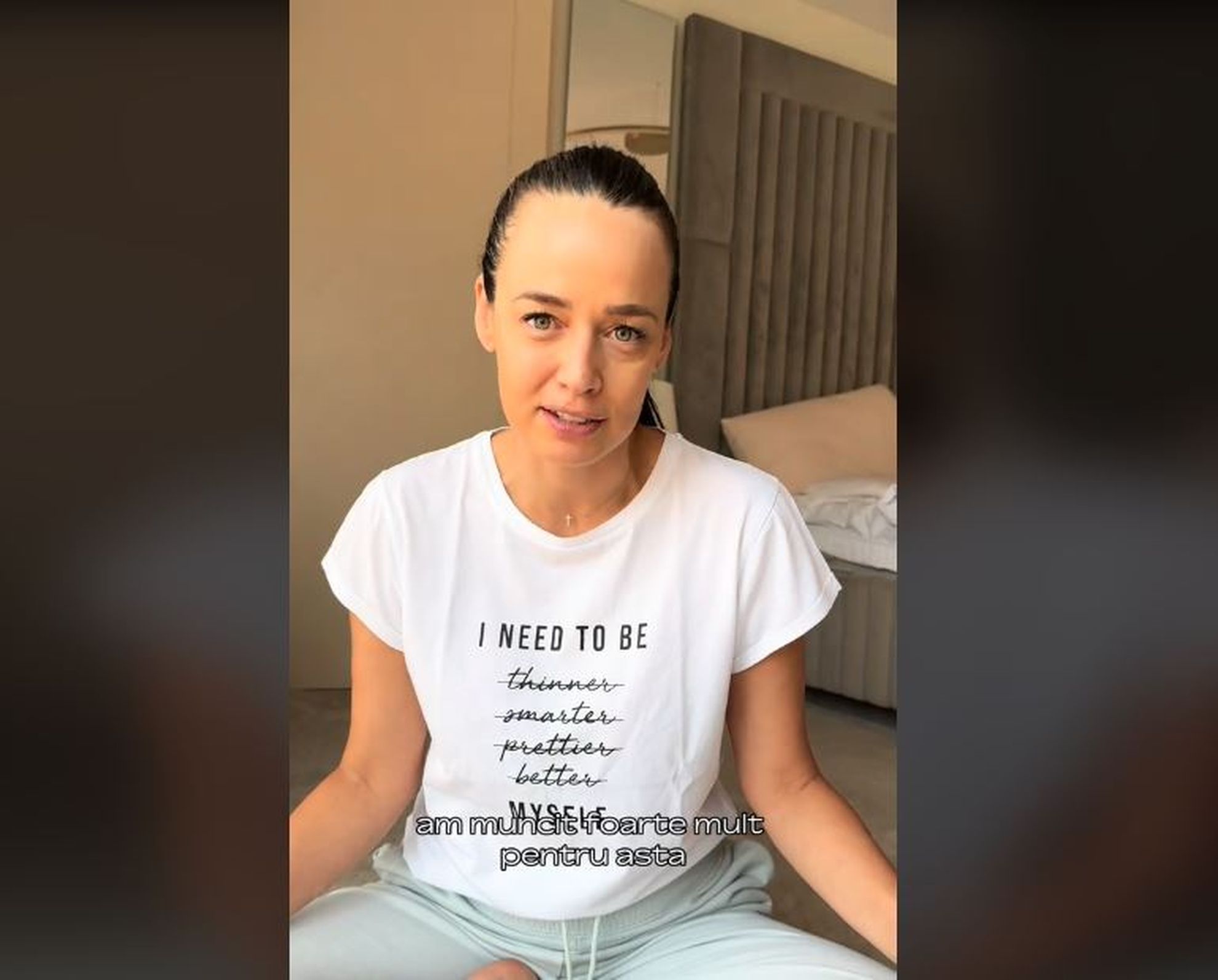 “Nu-mi vine să cred că la 46 de ani, au început să-mi placă toate părțile care acum nu sunt perfecte, cum erau la 20-30 de ani și pe care le uram. Efectiv la 20-30 de ani munceam mult să am acea perfecțiune, care bineînțeles că nu există, era doar în capul meu și la 46 de ani am ajuns să iubesc toate părțile din mine, chiar dacă nu sunt perfecte și de fapt îmi vine să cred, pentru că am muncit foarte mult pentru asta.