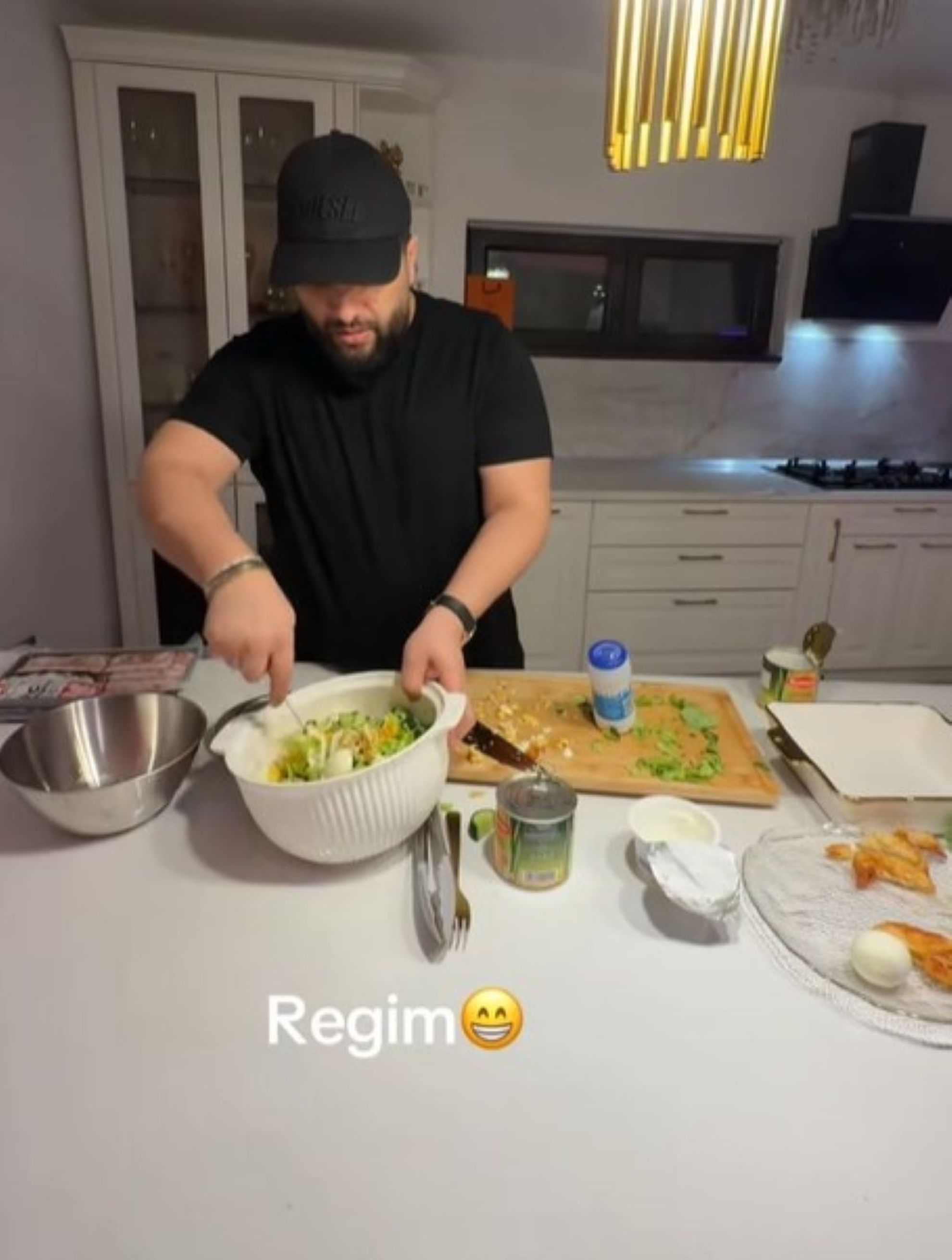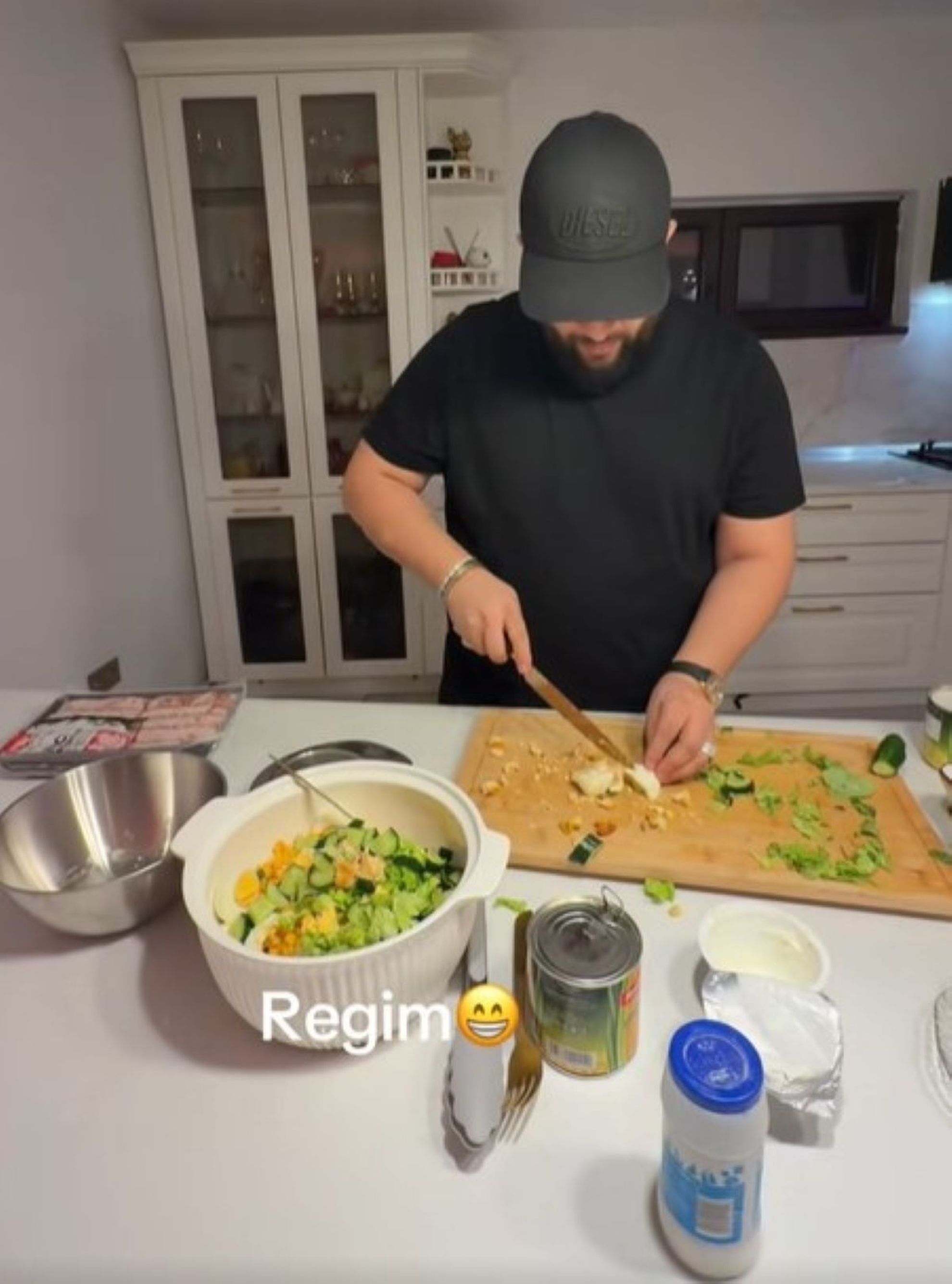 „Vă salut, prietenii mei! Că tot mi-ați dat comentarii toată lumea că am slăbit și eu un pic. Da, este adevărat că am dat vreo 7-8 kg jos pentru că am început o dietă de-asta, ca la mama ei. Avem aici carne de pui, ouă fierte, salată verde, castraveți, porumb, iaurt grecesc și bineînțeles, totul este cântărit. Totul este cântărit, dacă mănânci cântărit, mănânci cu măsură și știi exact câte calorii. Punem aici carnea, nu trebuie să lipsească niciodată iaurtul grecesc, ăsta e numărul unu. Și uite așa Tzancă mai slăbește! Să vină pe noi cum trebuie cămășile, costumele alea la evenimente, să se închidă așa cum trebuie. Uitați ce salată am făcut! Să mai pun porumb? Cred că ajunge… punem puțină sare. Cântarul e cântar, și acum amestecăm și am făcut o salată de s-a terminat șmecheria!”, a explicat Tzancă Uraganu.