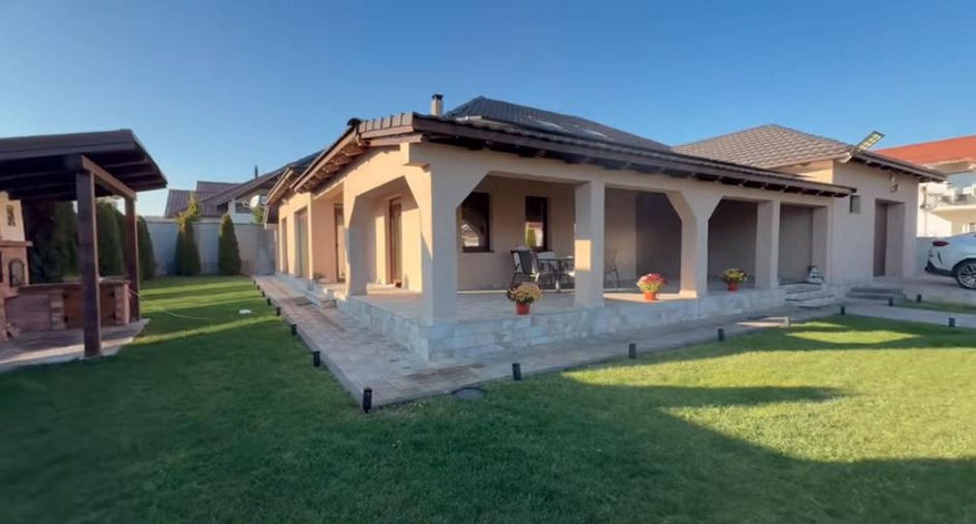 Aici avem un grătar, l-am folosit doar o dată, de ziua mea, dar la vară o să meargă non-stop, sunt sigur de asta. Deci, asta este casa, îmi place foarte mult. Are 324 de metri pătrați utili. Ce-mi place cel mai mult la casa asta e terasa asta imensă, aici o să mai bag eu vreo 2 mese cu mai multe scaune. La ziua mea au fost vreo 50 de persoane aici, a fost plin aici, a fost tare, foarte mulți au fost.