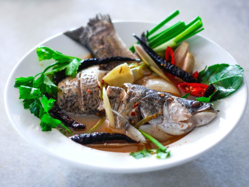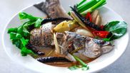 - Pune peștele fript în oală și fierbe încă 10 minute, până când se impregnează aromele și peștele e fraged.