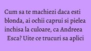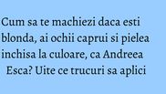 " Pentru inceput vreau sa va dau cateva sfaturi daca sunteti vopsita blond, aveti ochii caprui si pielea mai inchisa la culoare, cum este cazul elegantei Andreei Esca sau fiicei lui Lionel Ritchie, Nicole. In aceste cazuri, feriti-va de culori vibrante in ceea ce priveste fardul de ochi. Nu va recomand albastrul, verdele sau ciclamenul. Pentru ca blondul are tendinta de a estompa trasaturile, va recomand sa folositi culori calde: maro-uri, tonuri de pamant, rozuri pale sau culori pastelate, pentru a va contura. Pentru machiajele de seara, incercati fara grija smokey eye-uri, acele machiaje care se realizeaza cu nuante mai inchise dar foarte bine difuzate pentru a nu trasa linii dure si inestetice.