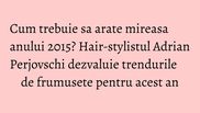 “Miresele anului 2015 vor purta coafuri cat mai lejere, naturale, fara sa fie exagerate. Se pune accent pe luciul parului si pe evidentierea trasaturilor fetei. Buclele alese sunt medii, foarte usor definite si cu varfurile mai lasate.