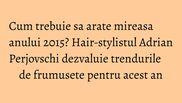 Trenduri de frumusete pentru miresele anului 2015, ce coafuri pot adopta femeile ca sa acapereze toate privirile in cea mai importanta zi a vietii lor, dar si care sunt greselile pe care le pot face in cautarea perfectiunii.