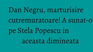„Am sunat-o pe Stela Popescu azi-dimineaţă. O făceam uneori din greşeală atunci când voiam să-l sun pe Răzvan Popescu din maşină şi când bluetooth-ul lua numele de Popescu dar apela Răzvan în loc de Stela. Se obişnuise după o vreme să îmi răspundă direct:“iar ai vrut sa-l suni pe finu’tau de la radio şi ai nimerit la mine”. Azi dimineaţa i-am şters numarul din telefon...", a scris Dan Negru pe Facebook, conform wowbiz.ro.