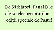 De Sarbatori, Kanal D aduce in fata telespectatorilor editii speciale ale emisiunilor preferate de romani, dar si o mini-serie biblica, potrivita Sarbatorii Pascale. Sambata, 7 aprilie, in Ajunul Pastelui, de la ora 17:15, Mihai Ghita, realizatorul emisiunii “Asta-i Romania!” va invita sa urmariti o editie emotionanta in care ne intoarcem la familie, traditii si obiceiuri romanesti pastrate de zeci de ani.