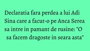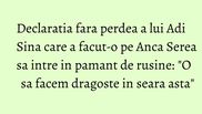 "Cu dragostea stam foarte bine. O sa facem si in seara asta", a spus Adi Sina. Imediat, Anca Serea s-a rusinat, i-a pus mana la gura sotului ei si a exclamat:" Doamne fereste!". "Lucram la urmatorul copil. Asta am spus", a completat Adi Sina pentru cancan.ro.