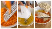 “ Curățăm morcovii, îi radem fin. Separăm cele 4 ouă, peste gălbenușuri adăugăm 1 lingură de ulei de cocos, 6 linguri de zahăr de cocos, amestecăm cu mixerul. Adăugăm apoi și morcovul ras, făina de migdale, praful de copt, fulgii de cocos, nuca, scorțișoara, vanilia.