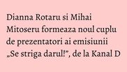 Mihai Mitoseru si Dianna Rotaru formeaza noul cuplu de prezentatori ai emisiunii „Se striga darul”, emisiunea al carei nou sezon va incepe, in curand, la Kanal D. Dianna Rotaru este o cunoscuta cantareata si actrita din Republica Moldova, pe care telespectatorii din Romania au avut ocazia sa o admire ca invitata in foarte multe show-uri autohtone, inclusiv in cele difuzate de Kanal D. Energia debordanta, frumusetea, spiritul viu o fac pe Dianna Rotaru alegerea perfecta pentru emisiunea „Se striga darul”, care isi propune sa descopere cele mai spectaculoase nunti din Romania si sa le transmita telespectatorilor acea stare de bucurie proprie acestor evenimente deosebite din viata oricarui cuplu.