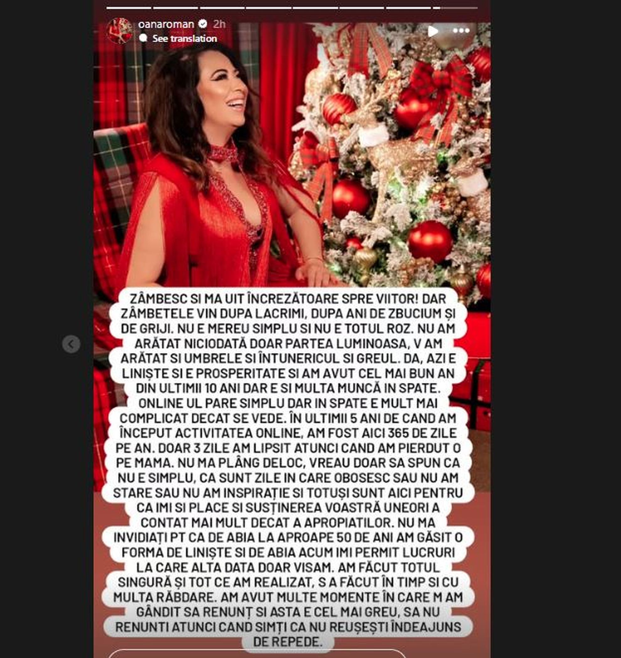 Nu mă invidiați pentru că de abia la aproape 50 de ani am găsit o formă de liniște și de abia acum îmi permit lucruri la care altădată doar visam. Am făcut totul singură și tot ce am realizat, s-a făcut în timp și cu multă răbdare. Am avut multe momente în care m-am gândit să renunț și asta e cel mai greu, să nu renunți atunci când simți că nu reușești îndeajuns de repede." , a fost mesajul transmis de Oana Roman, la fotografia postată pe contul său de Instagram, la Story.