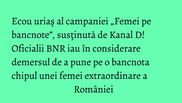 Campania „Femei de bancnote”, sustinuta de Kanal D, in colaborare cu Janina Nectara, a avut un ecou urias in spatiul public romanesc. Demersul vedetelor statiei pentru ca pe bancnotele romanesti sa se afle si figuri feminine care au constribuit decisiv la faurirea unui neam, a reusit sa deschida dialogul cu reprezentantii Bancii Nationale a Romaniei.