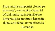 Dan Suciu, Purtatorul de cuvant al acestei institutii, a intervenit in cadrul unei emisiuni televizate pentru a declara ca solicitarea „Femei de bancnote” este „cu adevarat intemeiata” si ca surprinde o realitate actuala ce trebuie luata in considerare. Oficialul BNR a mentionat ca in perioada urmatoare va fi analizata modalitatea prin care sa poata fi emisa o bancnota de circulatie nationala, pe care sa fie expusa o femeie de exceptie a Roamaniei. „Este o cerinta a societatii si un semn de deschidere pentru Banca Nationala”, a mai spus Dan Suciu, in interventia televizata.