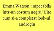 Emma a fost impecabila intr-un costum negru, completat cu camasa alba si stiletto negri. In ceea ce priveste accesoriile, actrita a ales un clutch argintiu, cerce simpli si o serie de inele subtile. Cu toate acestea, look-ul ei androgin a fost impecabil.